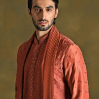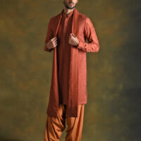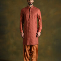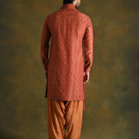 Wear this gorgeous TERRACOTTA kurta salwar set in a rich russet shade to embrace the appeal of classic style. With its monochromatic rich look & diagonally embroidered pattern on the front and motif pattern on the sleeves, this mesmerizing combo oozes refinement and elevates your style. Created with modal cotton blended with silk it makes this outfit well aerated. Indulge in this striking ensemble that is sure to capture everyone’s attention, whether you’re at a festival celebration or pre-wedding ceremony.