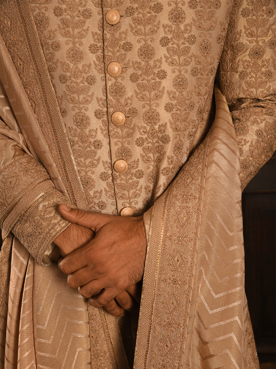 The Rose Gold Grandeur: A Royal Affair to Remember Step into a world of unparalleled luxury with this exquisite Rose Gold sherwani, a center piece of our ‘A Royal Affair to Remember’ collection. Designed for the groom who demands both tradition and contemporary grandeur, this piece is a true work of art.