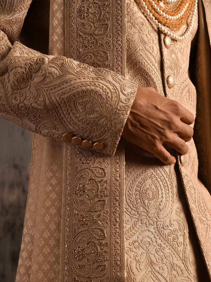 The Mughal Tapestry Sherwani: Rose Gold Heirloom Step into a legacy of unparalleled grandeur with the Mughal Tapestry Sherwani in luminous Rose Gold, a true masterpiece from our ‘A Royal Affair to Remember’ collection. This garment is a captivating fusion of historical artistry and contemporary wedding style.