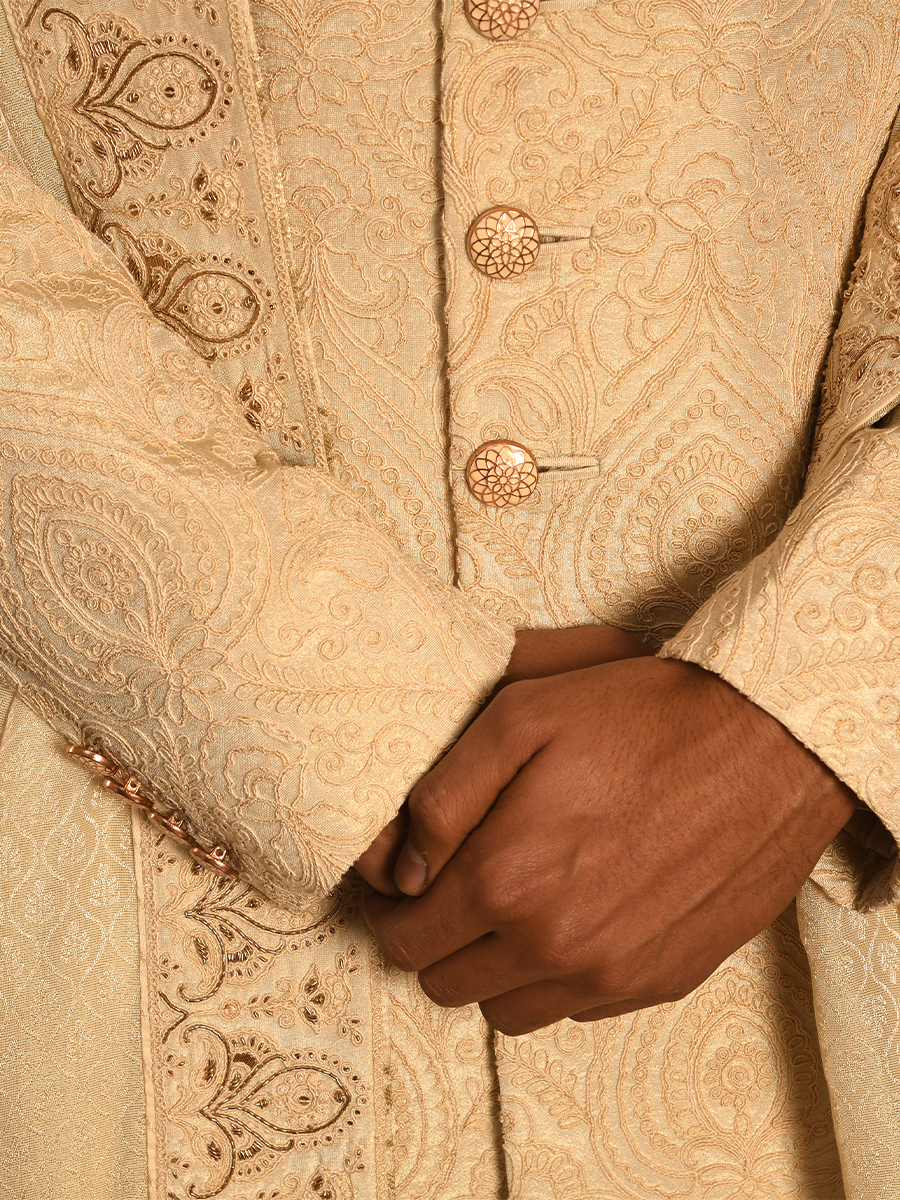 This stunning light beige sherwani is the epitome of royal elegance. It has self-jacquard pattern created with intricate dori embroidery, it features a majestic collar highlighted with exquisite hand Zardozi work