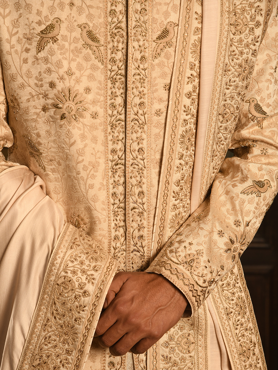 Regal Inlay: The Beige Royal Sherwani Ensemble Step into a legacy of craftsmanship with this breathtaking Beige Sherwani from our ‘A Royal Affair to Remember’ collection. This piece is a true homage to Indian artistry, blending majestic historical patterns with flawless modern tailoring.