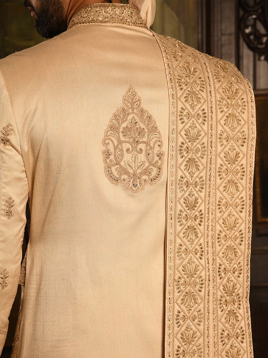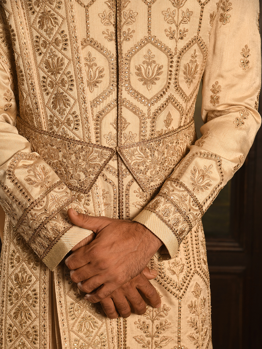 The Gilded Geometric: Golden Beige Anarkali Sherwani Discover the zenith of ceremonial elegance with this commanding Golden Beige Sherwani, a luxurious piece from our ‘A Royal Affair to Remember’ collection. This ensemble flawlessly combines structured tailoring with fluid heritage patterns.